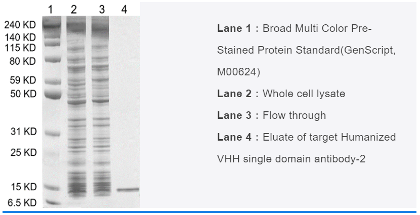 該產(chǎn)品的親和配基Anti-Humanized VHH Antibody對人源化VHH較高的親和力和特異性使其能夠從常用的蛋白質(zhì)表達系統(tǒng)(如細菌、酵母和哺乳動物細胞)中獲得較高純度的人源化VHH(如圖4所示)。