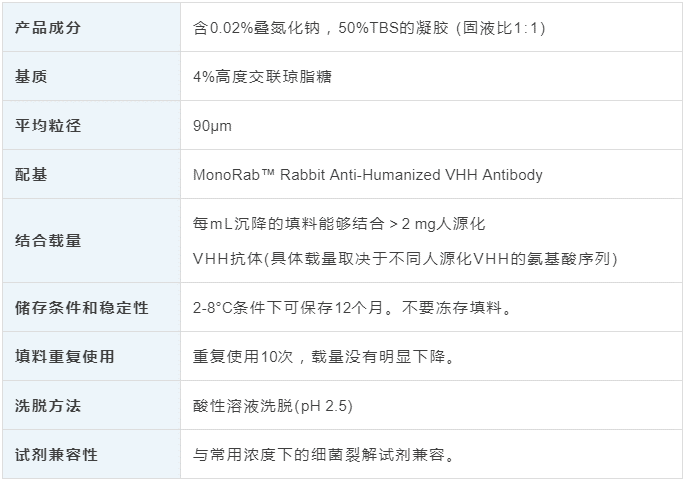 金斯瑞MonoRab? Anti-Humanized VHH Affinity Resin FF的主要特性如下表: